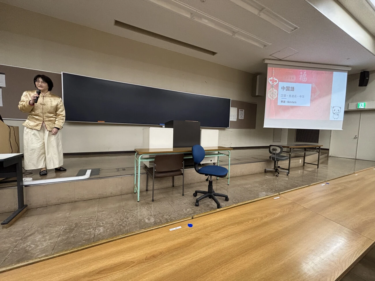 翌4月3日には、言語文化講座ガイダンスが行われました。最初に601教室で、地域言語教育委員会のミヤ・ドゥイ・ロスティカ准教授より、講座の概要について説明がありました。続いて、各言語の担当教員と、2・3年生の履修学生による言語紹介が行われ、それぞれの言語の魅力が紹介されました。その後、新入生は中国語、コリア語、ベトナム語、インドネシア語、タイ語、ヒンディー語、アラビア語、英語の各教室を自由に訪問し、全体説明では聞けなかった話を先生や上級生たちから直接聞くことで、言語選択の参考にしました。