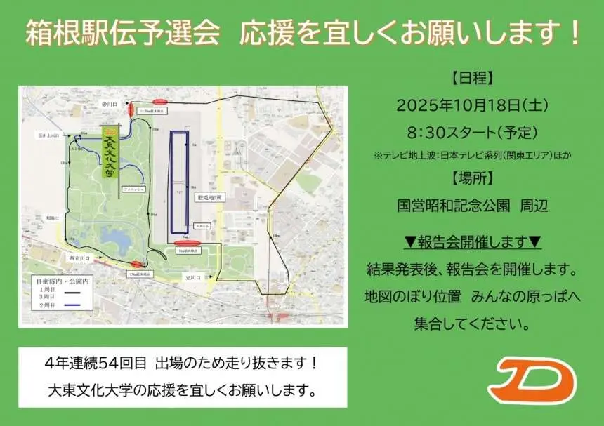 2025年10月18日(土)に陸上自衛隊立川駐屯地~立川市街地~国営昭和記念公園(東京都・立川市)で開催される第 102 回東京箱根間往復大学駅伝競走予選会に本学陸上競技部男子長距離が出場いたします。本戦出場を目指し駆け抜けます。ご声援のほどよろしくお願いいたします。