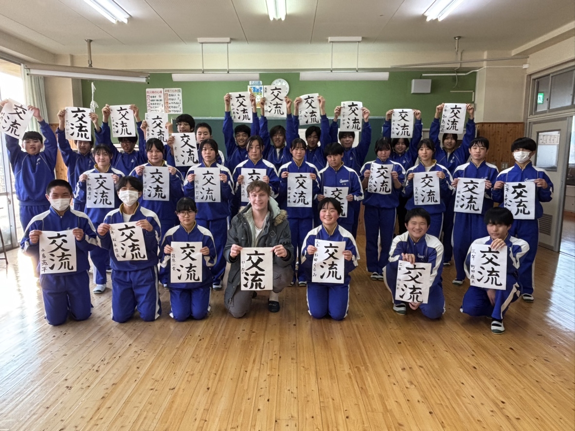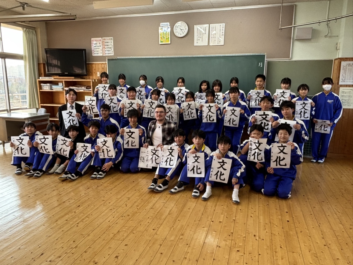全体の場では、2人から母国の伝統や文化について発表し、生徒たちから2人へときがわ町についてご紹介をいただいた後に、ドイツ・アメリカそれぞれの国の言葉でのじゃんけん大会で盛り上がりました。後半は日本の文化体験として書道に初挑戦し、生徒たちから親切に教えてもらいながら作品を書きました。