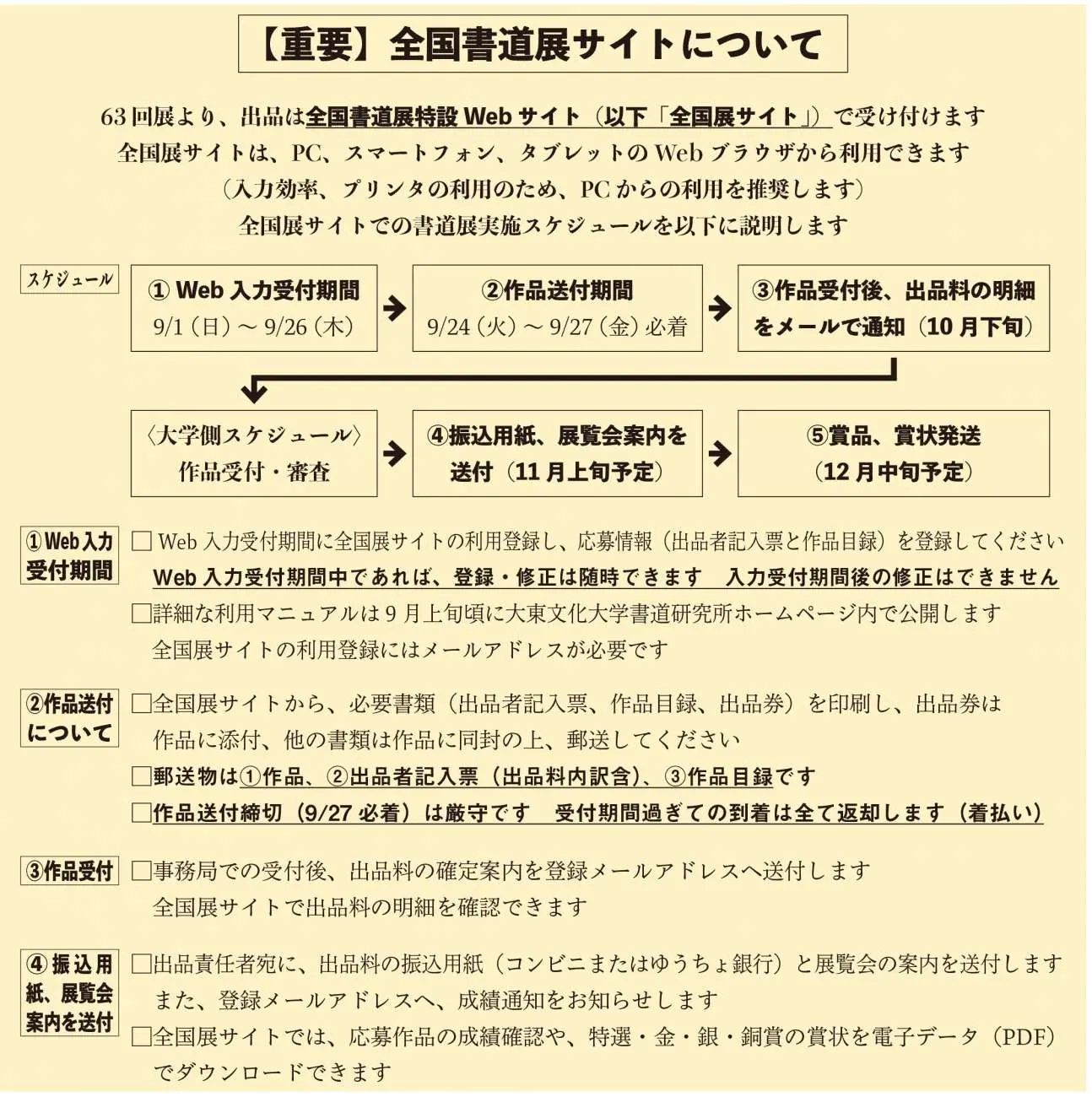 Web上にて出品応募情報を入力後に作品を送っていただく方法になります。当事務局での入力代行は行っておりません。また、紙での「出品者記入票」、「出品目録(半紙、条幅)」、「出品券」は用意していません。全てWeb入力です。Webサイト情報をよくご確認の上、ご応募ください。