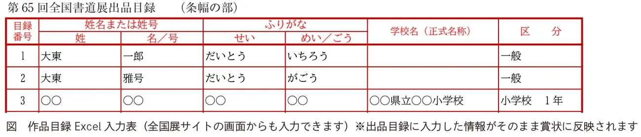 「一般(漢字→漢字仮名交じり書→仮名)」→「大学生(※)」→「高校生(※)」→「中学生」→「小学生」→「幼児」 の順で入力し、作品もこの順番にしてください
