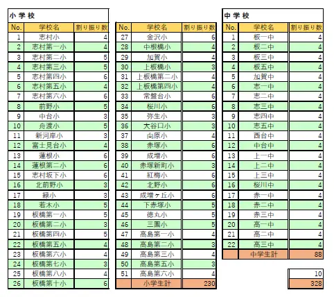 □参加可能数を中学校は一律配分、小学校は各校の児童数に応じて割当数を算出し配分しています