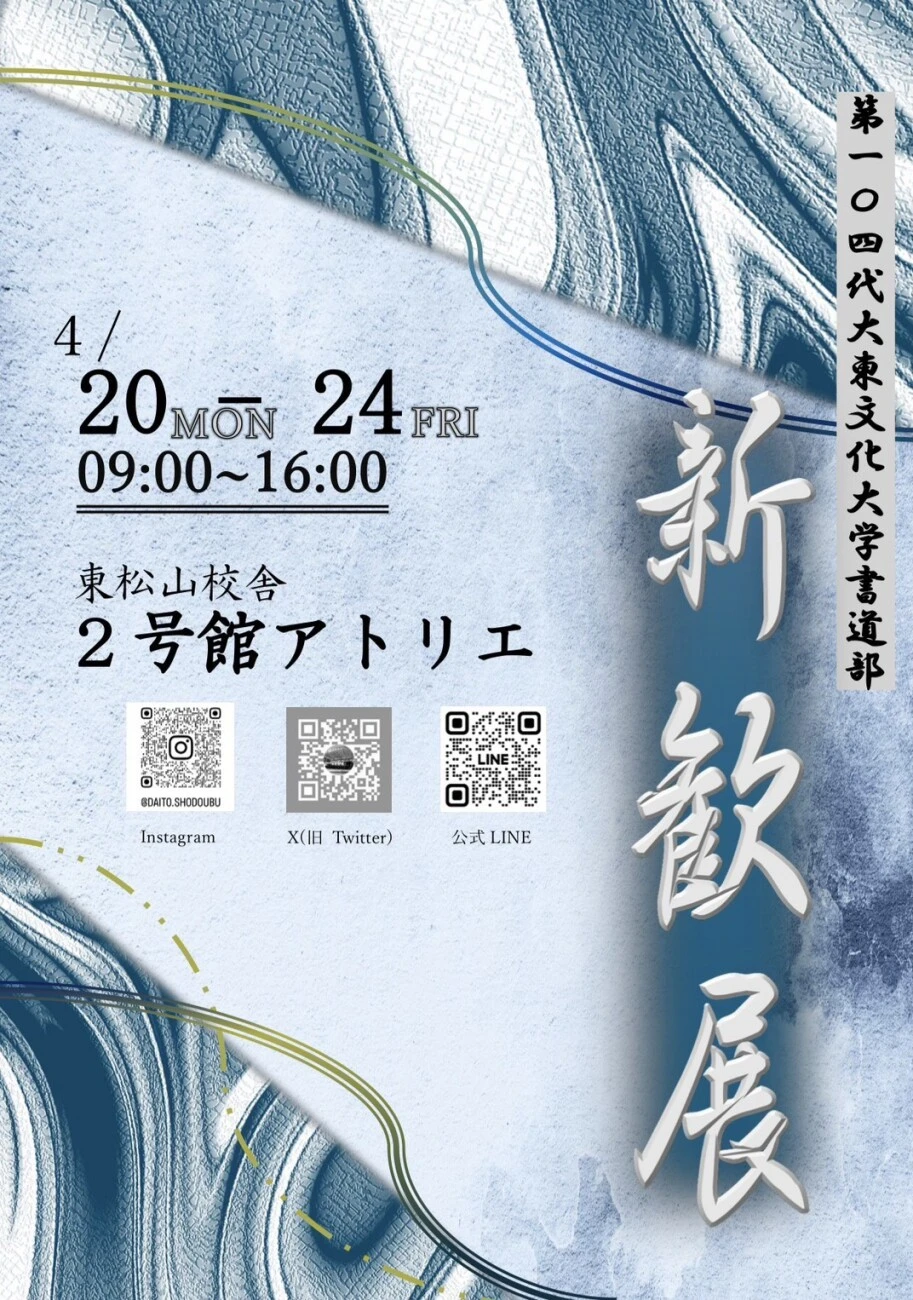 書道部による「新歓展」を下記の通り開催しております。ご高覧賜りたく、ご案内申し上げます。会期:2026年4月20日(月)~4月24日(金)日時:月曜日~金曜日/9時~16時会場:大東文化大学東松山校舎2号館3階アトリエ