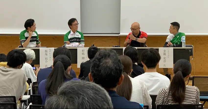 後半はゲスト2名と野嶋剛所長をパネリスト、飯塚裕介准教授をモデレーターとして、サイクルツーリズムや交通教育と日本の自転車分担率の高さなどを話題にして盛り上がりました。このパネルディスカッションでは、とにかく自転車は楽しいということで終始一貫し、壇上の4名と50人以上の会場の聴衆が笑顔と自転車熱で包まれつつ、2時間半のイベントが終了しました。