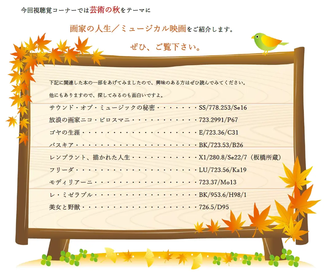 東松山図書館の地下1階にある視聴覚フロアが、ようやく秋のテーマになりました!(夏が長かったから。。。)