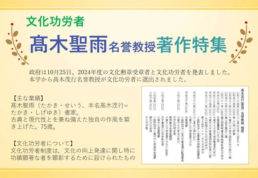 10月25日(金)に2024年度の文化勲章受章者と文化功労者が発表され、書道学科の髙木茂行名誉教授が書家として文化功労者に選出されました。