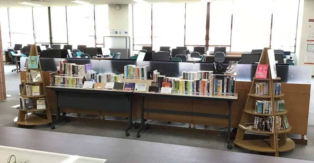 東松山図書館1階では図書館ボランティアが学生選書ツアーで選んだ本が展示されています。