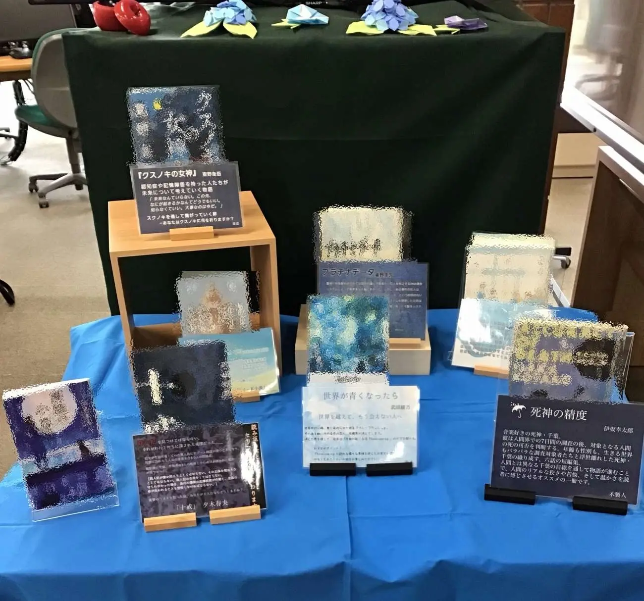 東松山図書館1階入口付近にて、DBU図書館ボランティアが「表紙が青い本」の展示を作りました。