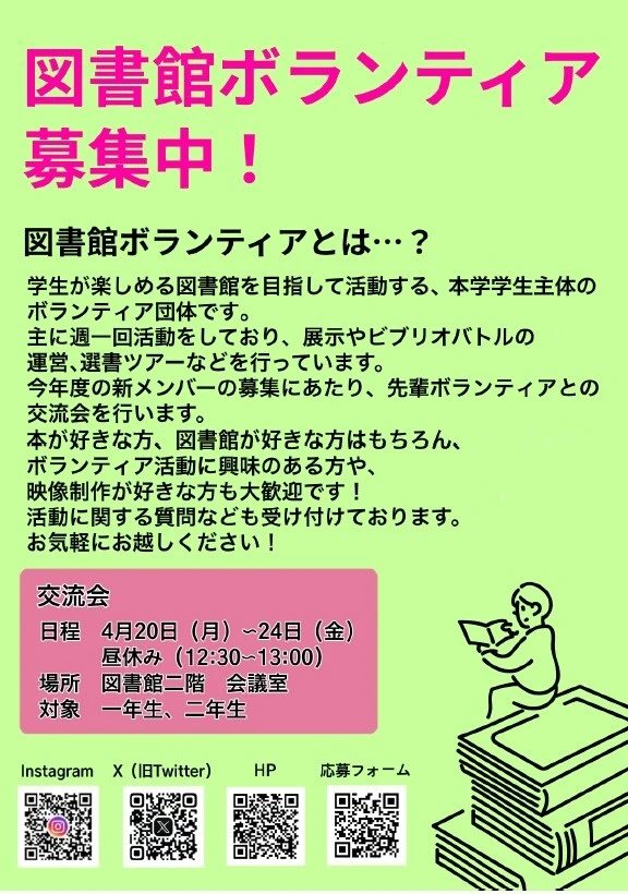 本好きな方、図書館好きな方はもちろん、ボランティア活動に興味のある方も大歓迎ですので、是非ご応募ください。