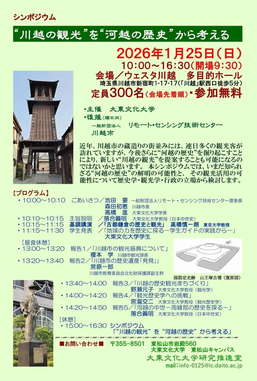今回はそうした試みを踏まえ、川越市の歴史と観光をめぐって、大東文化大学、川越市、一般財団法人リモート・センシング技術センター、NHKさいたま放送局が共催し、シンポジウムを行います。