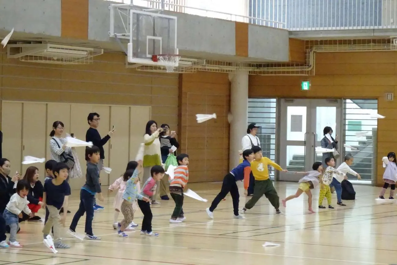 昨年度もご好評いただきました日本航空株式会社様協力の【JAL折り紙ヒコーキ教室】では、日本航空株式会社様によるレクチャーのもと、親子で紙ヒコーキを折り、自作の紙ヒコーキを実際に飛ばして距離を競い合いました。お子様はもちろん、久々に折り紙と触れ合う保護者の方も紙ヒコーキづくりに夢中になり、体育館は終始活気に溢れていました。