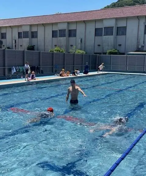 小学生の皆さんに、バタ足・けのび等の基本動作やクロール等の泳ぎのコツについて、実演も交えて指導を行いながら、交流しました。