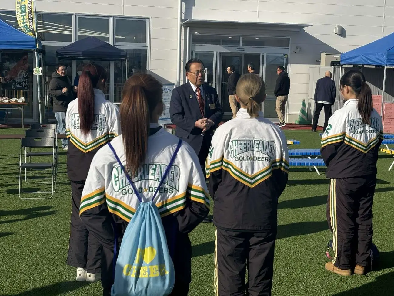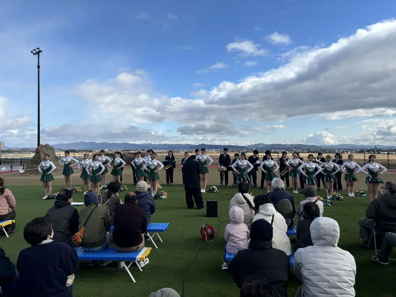 東松島市の新たな観光拠点として11月27日(水)にオープンした「道の駅東松島」で、オープン後初めて迎える週末となった11月30日(土)に、本学の全學應援團リーダー部・チアリーダー部と吹奏楽団の学生36名がオープニングイベントのセレモニーに参加し、パフォーマンスを披露しました。午前と午後の2回行われたパフォーマンスには、オープン後初めての週末ということもあり多くの来場者で賑わう中、多くの皆様に足を止めてご覧いただきました。全學應援團リーダー部・チアリーダー部と吹奏楽団の学生にとっても、東松島市の方々と交流する大変貴重な機会となりました。