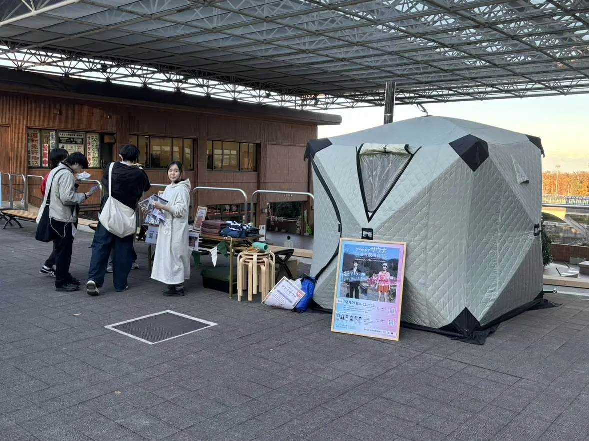 会場周辺には、キッチンカーや東松山市内のコーヒーショップ13COFFEEさんによるカフェ販売ブース、本学が参画している埼玉東上地域大学教育プラットフォーム(TJUP)の事業者等会員でもあります株式会社温泉道場様によるテントサウナ体験ブースを設置し、点灯式開始前からキャンパスプラザ周辺は賑わいを見せていました。