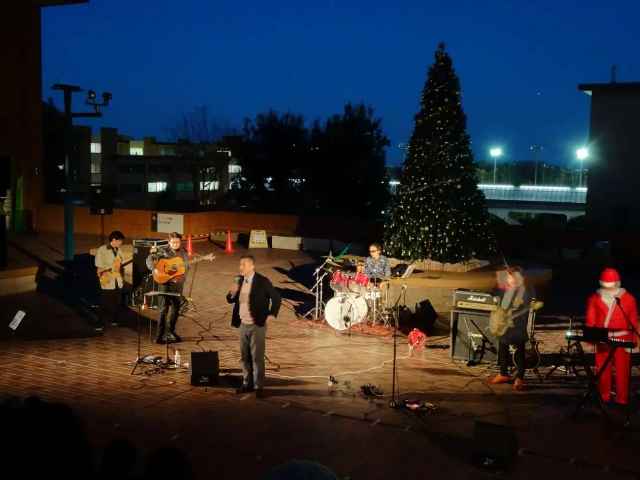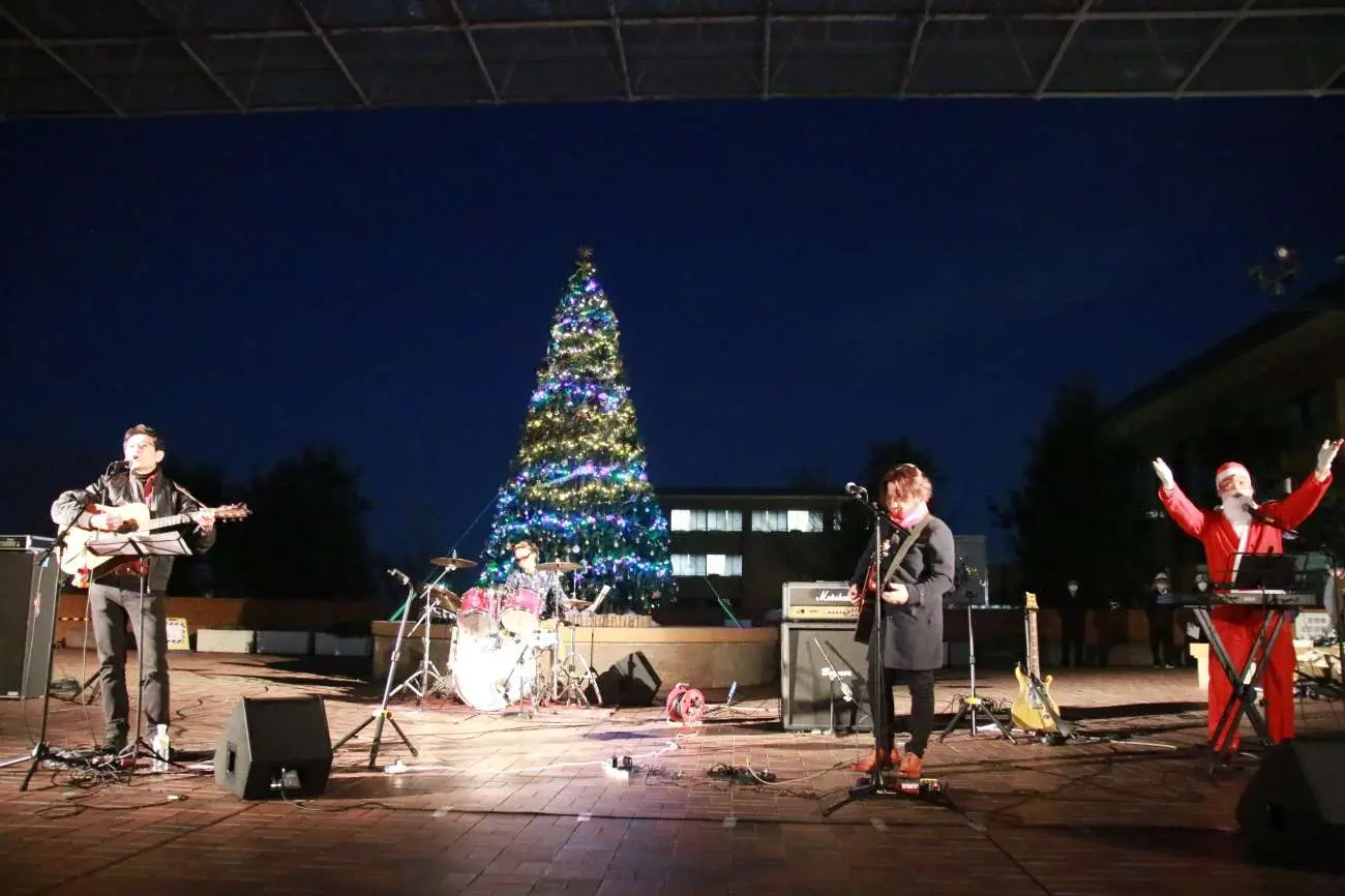 ツリー点灯後は、職員有志+軽音楽部B.B.Qのコラボバンドによるクリスマススペシャルライブや、学生自治会中央執行委員会企画の豪華景品付きビンゴ大会を行い、会場は大いに盛り上がりました。参加者には、クリスマスプレゼントをお配りし、閉会後にはクリスマスツリー前で子どもたちの撮影会も行われ、一足はやいクリスマスを楽しんでいただきました。