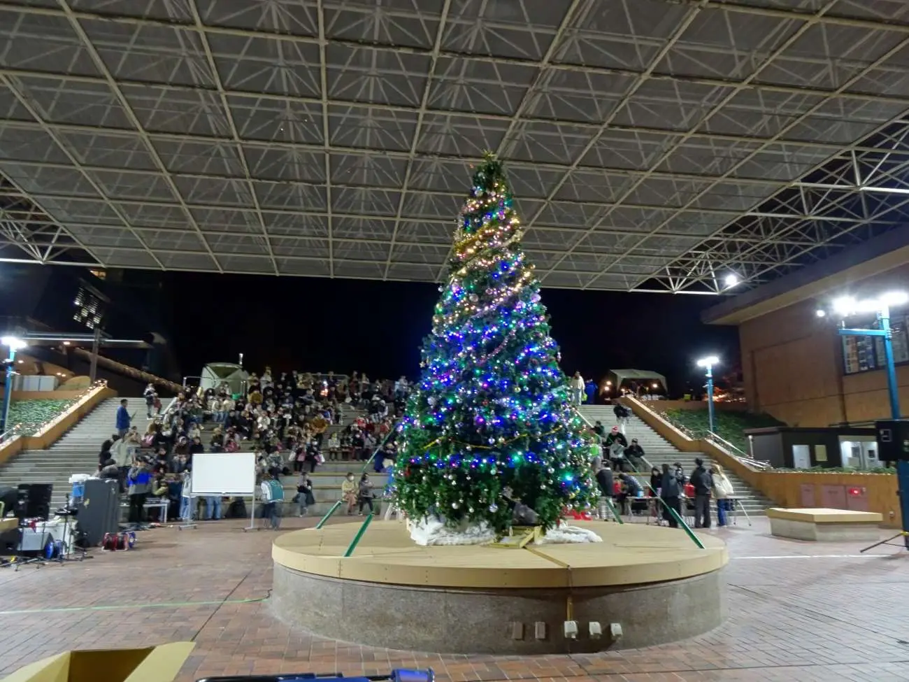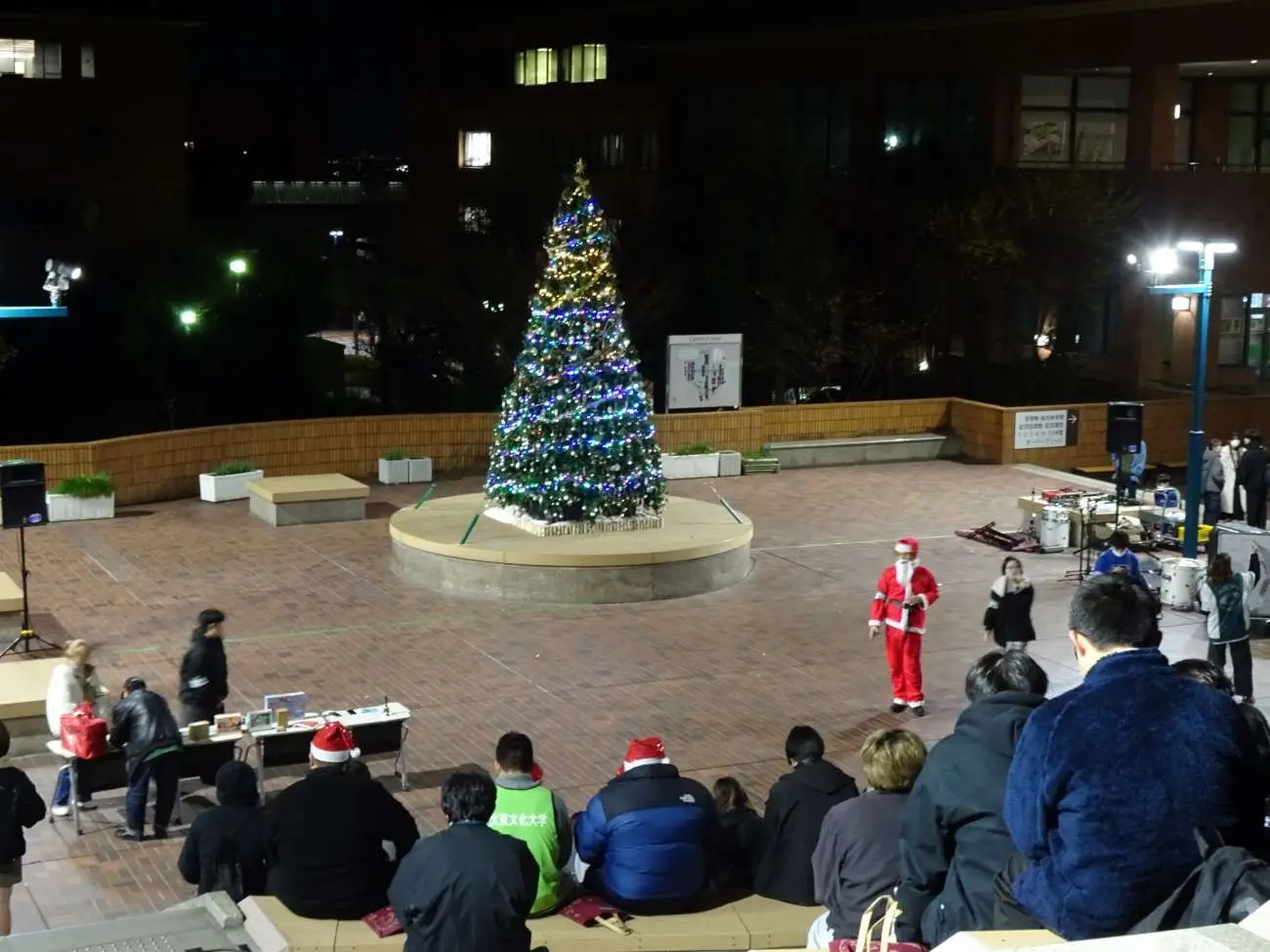 点灯式は、音響・司会担当の放送協会(DHK)の学生の進行で行われ、高橋学長のカウントダウンで約5mの巨大クリスマスツリーのイルミネーションが点灯しました。