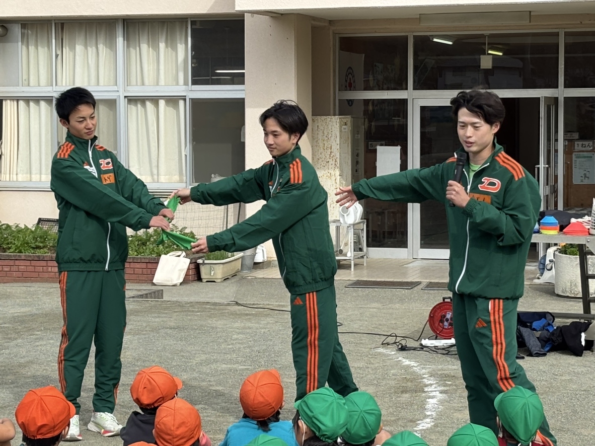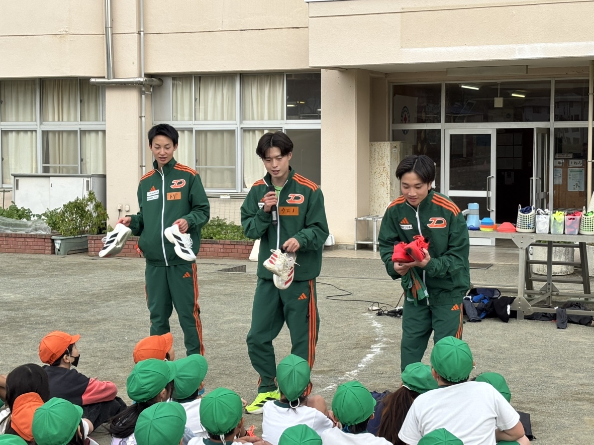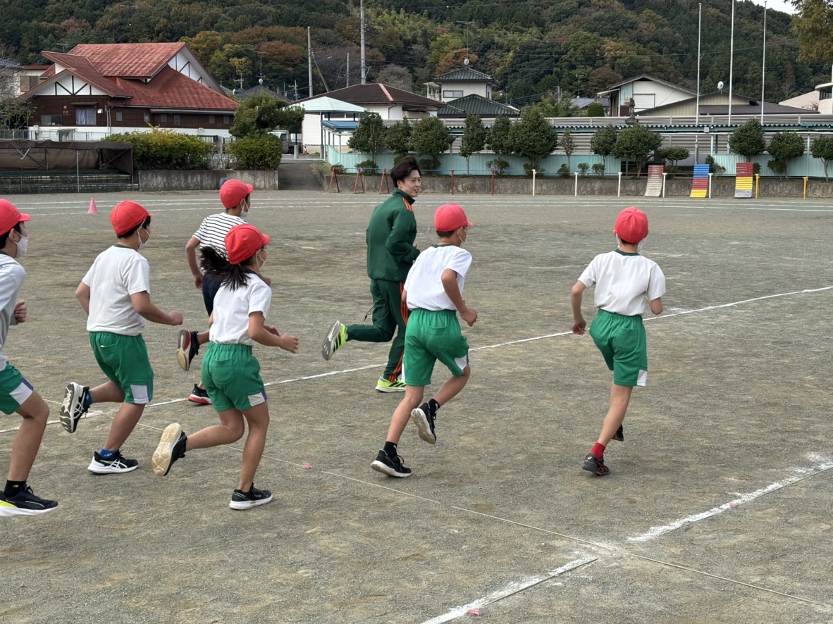 本学が包括連携協定を締結している埼玉県ときがわ町との連携事業の一環で、本学の陸上競技部(男子長距離)3名が11月11日(火)にときがわ町立明覚小学校で持久走指導を行いました。小学1~6年の全学年の皆さんへ、長距離走のフォームや呼吸の仕方のコツ、実際の大会で使用する襷やシューズ、ウェアの紹介なども交えて指導を行い、授業の最後には一緒に走りながら楽しく交流しました。