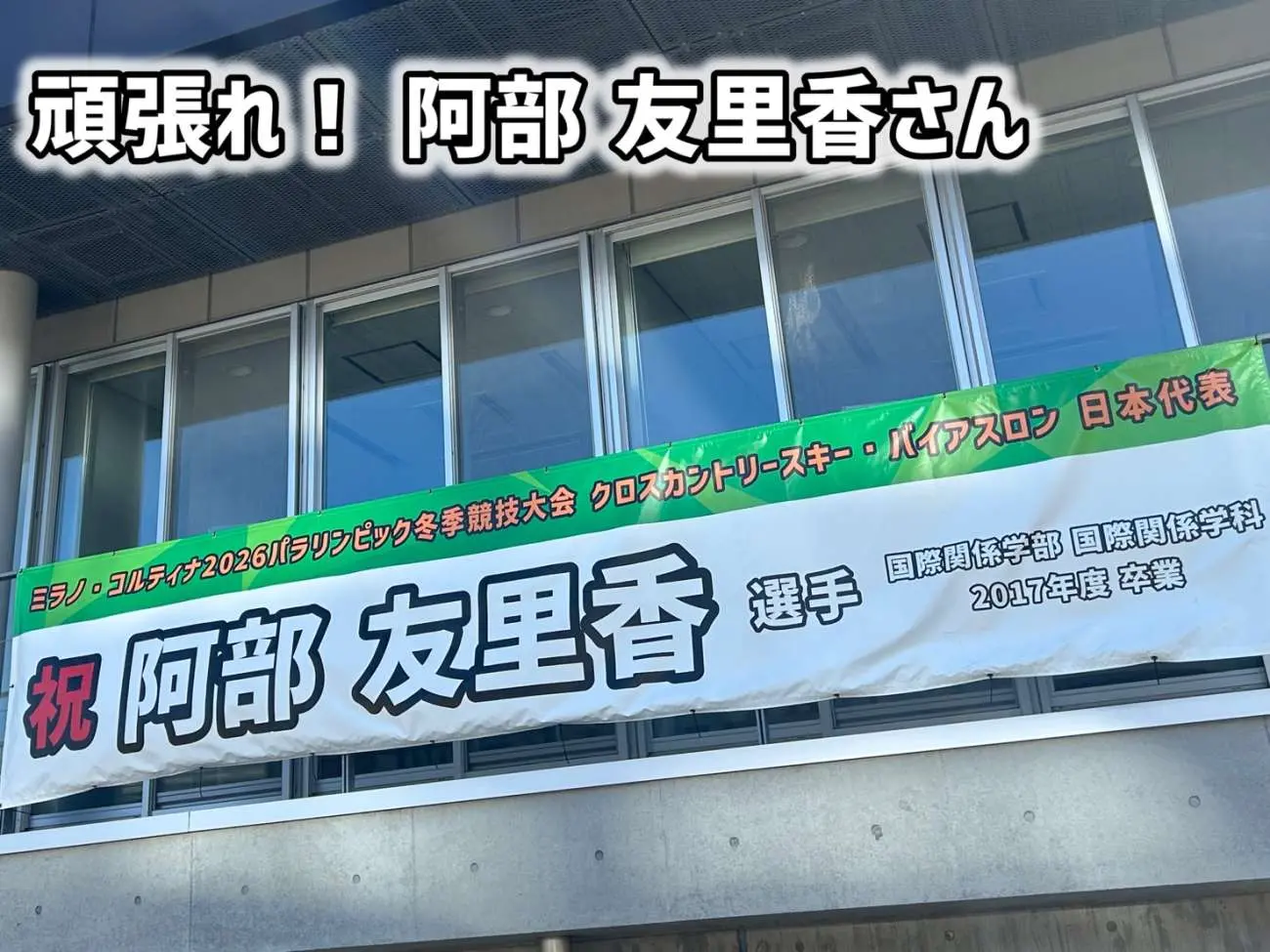 2026年3月6日(金)から15日(日)までイタリア・ミラノとコルティナ・ダンペッツォで開催されます「ミラノ・コルティナ2026パラリンピック冬季競技大会」へ本学スキー部OG 阿部 友里香 選手がクロスカントリースキー並びにバイアスロンで日本代表入りを果たしました。阿部選手の日本代表選出を祝しまして、本学両キャンパスには横断幕を掲示しています。活躍を期待しております。