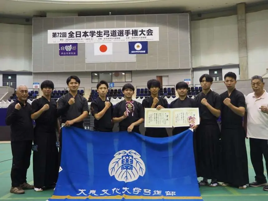 2024年8月22日(木)~24日(土)にグリーンアリーナ神戸(兵庫県神戸市)にて開催された第72回全日本学生弓道選手権大会に本学弓道部が男子団体戦、女子団体戦に出場。男子団体戦において第3位入賞と躍進する結果となりました。また、男子個人戦に出場した須之内 太陽 選手(法律4年)が第5位に入賞しました。