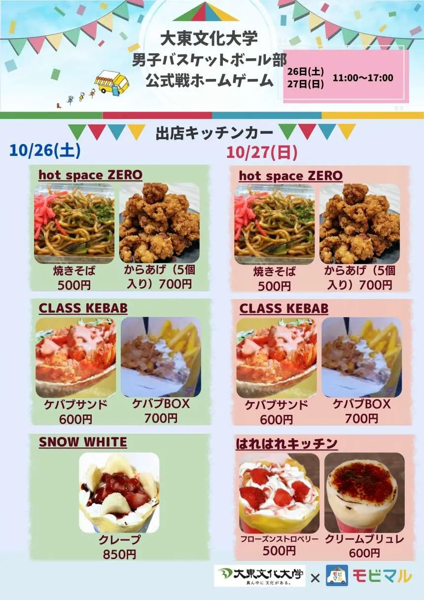 イベント:お菓子配布、SDGs企画(スポーツウェア衣料品リユース)、男子バスケットボール部グッズ販売、キッチンカー出店、サインボール投げ入れ、フリースロー大会、クロスワード等