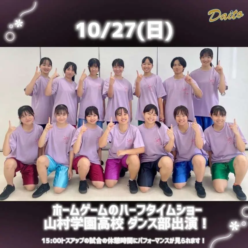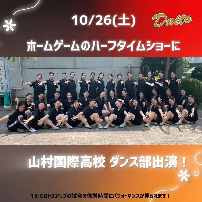 15:00開始 ホームゲームでのトスアップ、ハーフタイムショーには、東武東上線沿線に校舎がある学校法人山村学園2つの高校(山村国際高校、山村学園高校)ダンス部が協力。アリーナを盛り上げます!