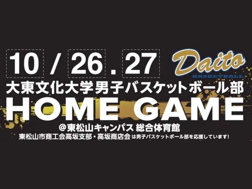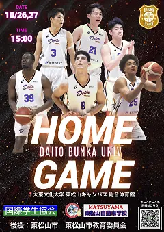 2024年10月26日(土)、27日(日)本学東松山キャンパス総合体育館で開催する「第100回関東大学バスケットボールリーグ戦1部」にて、男子バスケットボール部はホームゲームを2日間開催します。音響・映像演出やハーフタイムイベントの他、グッズ販売、キッチンカー出店等、興行型試合を通じて、地域住民をはじめとした子供達、学生、学園関係者にバスケットボールの魅力を発信することを開催趣旨としています。