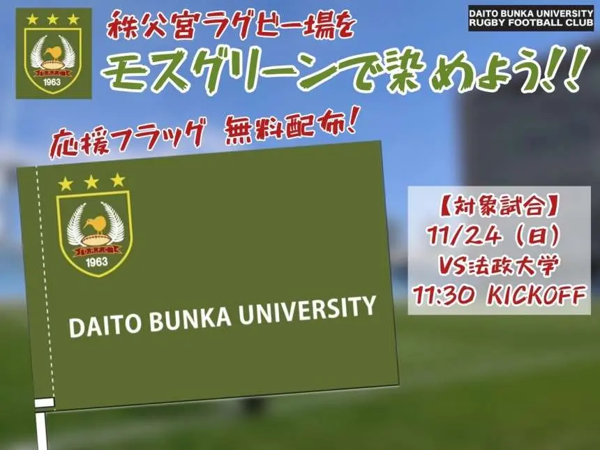 大東文化大学ラグビー部は、2024年11月24日(日)11:30キックオフ 秩父宮ラグビー場にて開催される関東大学ラグビーリーグ戦vs法政大学戦にて、2017年以来のリーグ戦優勝、12月から開催される全国大学ラグビー選手権への出場を賭けた試合を戦います。当該試合にて、応援フラッグを無料配布を行います。モスグリーン色でスタンドを染め、チームと共に戦い、優勝へ導きましょう!