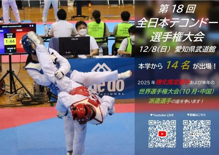 2024年12月8日(日)に愛知県武道館(愛知県名古屋市)で開催される第18回全日本テコンドー選手権大会に本学テコンドー部から14名の選手が出場します。