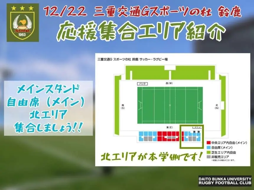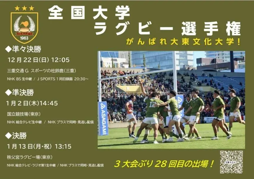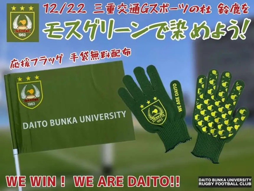 ラグビー部は2024年9月8日〜11月24日に渡り行われた、関東大学ラグビーリーグ戦1部にて優勝し、「第61回全国大学ラグビーフットボール選手権大会 」への出場を決めました。選手権大会出場は3大会振り28回目。1995年(第31回大会)以来の優勝を目指します。本学の初戦は準々決勝12月22日12時05分 会場は三重交通G スポーツの杜鈴鹿です。当該試合にて、応援フラッグ、応援手袋無料配布を行います。モスグリーン色でスタンドを染め、チームと共に戦い、勝利へ導きましょう!併せて「全日本大学ラグビー選手権遠征募金」を募集しております。ご協力のほど、よろしくお願いいたします。