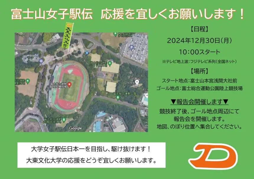 2024年12月30日(月)に富士宮本宮浅間大社前~富士総合運動公園陸上競技場(静岡県・富士市、富士宮市)で開催される2024全日本大学女子選抜駅伝競走に本学陸上競技部女子長距離が出場いたします。