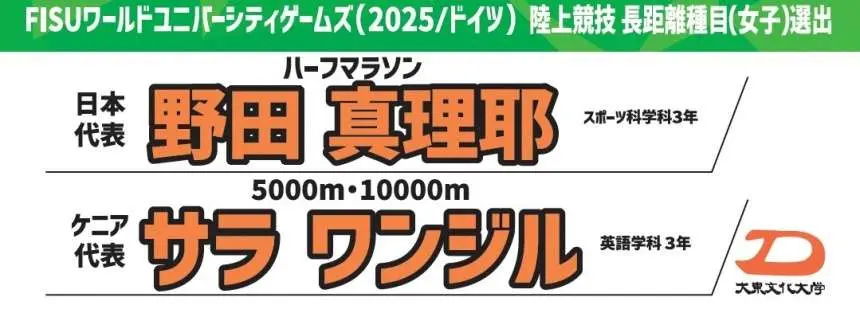 2025年7月16日(水)から27日(日)までドイツ(ライン・ルール)にて開催する、FISUワールドユニバーシティゲームズへ、陸上競技部女子長距離ブロック以下2選手が出場します。ご声援宜しくお願い致します。