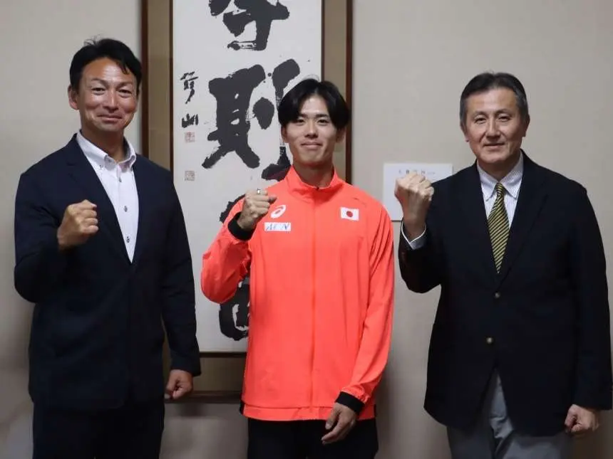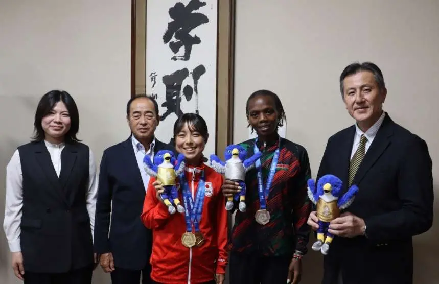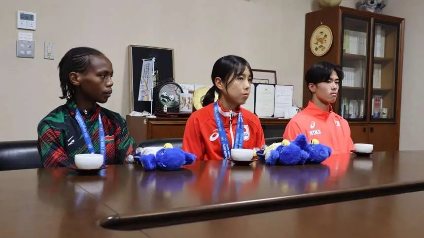 2025年9月24日(水)陸上競技部 野田真理耶選手、サラ・ワンジル選手と、短距離 守祐陽選手が高橋 進学長を表敬訪問しました。