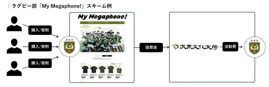 学校法人大東文化学園(大東文化大学)では株式会社博報堂と契約し、運動部部活動の公式オンライングッズショップ「My Megaphone!」を運営しています。大東スポーツ応援者の一体感の醸成を主旨とし、グッズ販売収益の一部を博報堂より各部活動への協賛金として大東文化学園(大東文化大学)が受け取り、運営資金として活用する仕組みです。