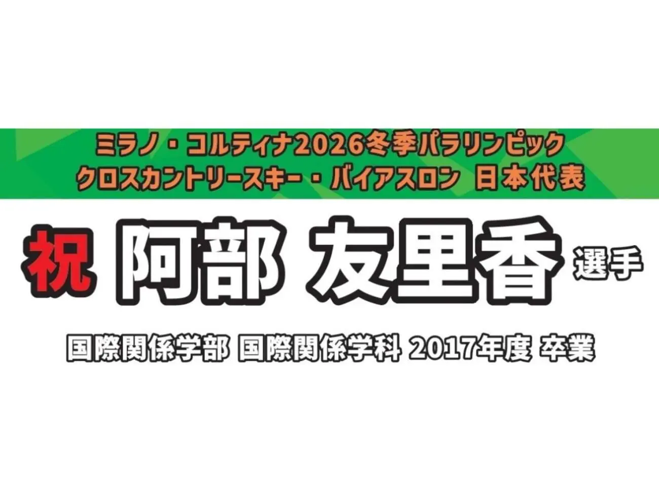 2026年3月6日(金)から15日(日)までイタリア・ミラノとコルティナ・ダンペッツォで開催されます「ミラノ・コルティナ2026パラリンピック冬季競技大会」へ本学スキー部OG 阿部 友里香 選手がクロスカントリースキー並びにバイアスロンで日本代表入りを果たしました。阿部選手の日本代表選出を祝しまして、本学両キャンパスには横断幕を掲示しています。活躍を期待しております。