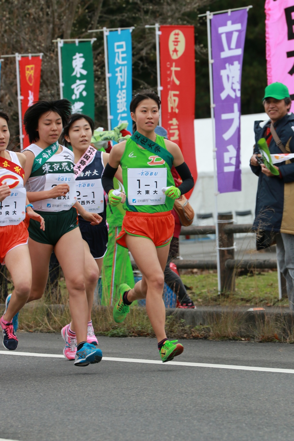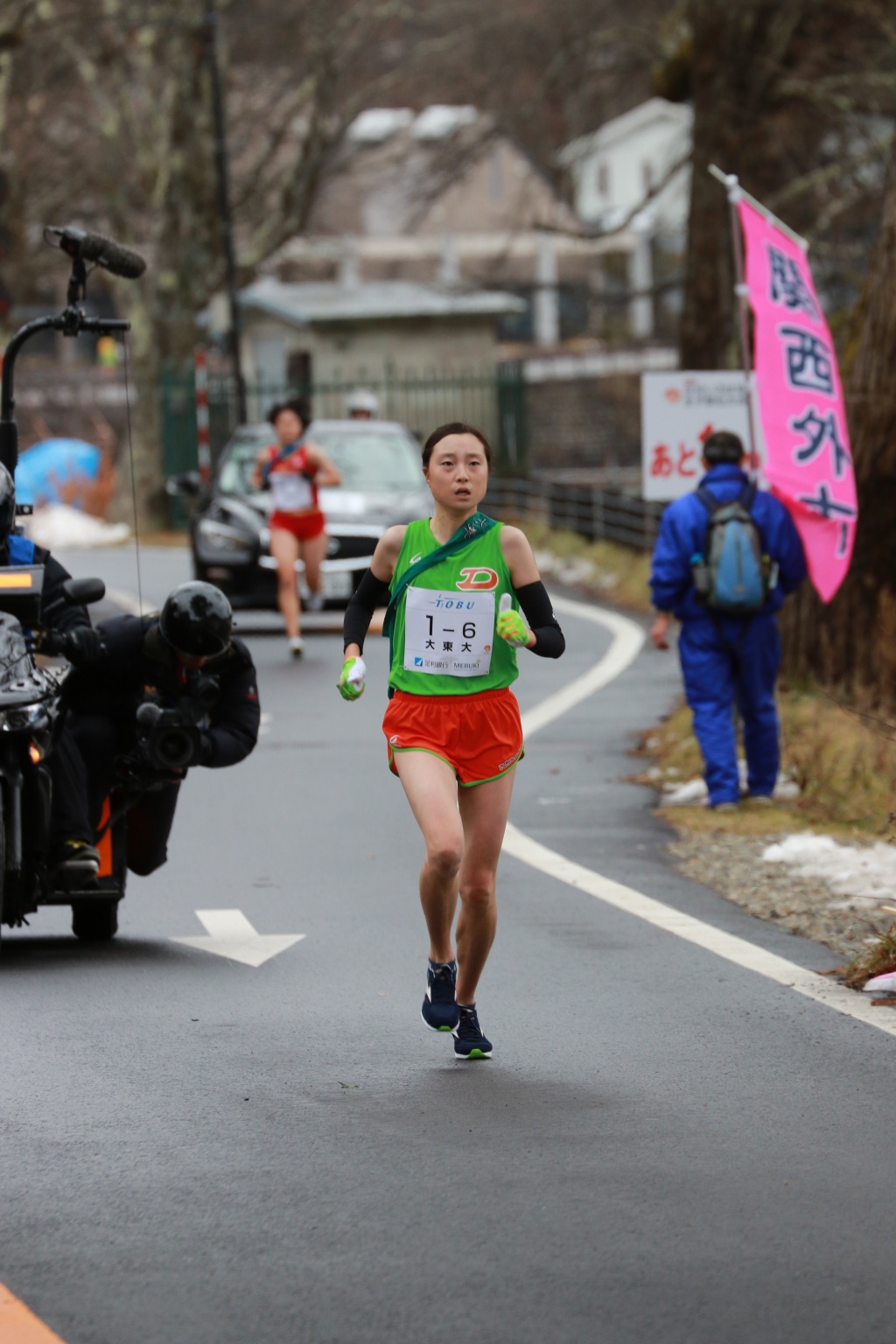 関東女王として各大学からマークされる本学は、第1中継所でトップ中央大学と1分20秒差の8位でリレー。後方から追い上げる展開となったが、この苦しい流れを断ち切ったのが第2区を任された山口可純選手(スポーツ科1年)だ。区間新記録となる力走でぐんぐんと追い上げ、順位を4位まで押し上げる。第4区の伊藤望選手(スポーツ科2年)も区間賞の快走でさらに順位を押し上げ、最終区間の6区を走る齋藤暁選手(英語2年)にはトップと22秒差の2位でタスキリレー。