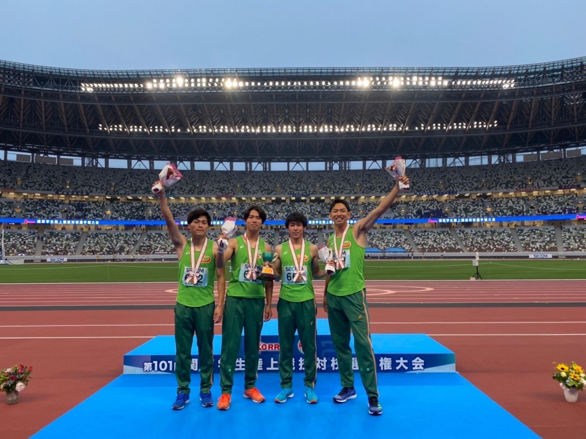 4継で2連覇と大会記録を更新することができました。昨年はメンバーから外れていたため、4継に対する想いは個人種目以上にありました。新国立競技場という陸上競技の聖地で優勝できたことはたいへん嬉しく思います。今回の結果は通過点だと考えています。秋には日本インカレ、日本選手権リレーが控えています。チーム一丸となり目標である「日本一」を獲得できるように準備を進めていきたいと考えています。引き続き、応援よろしくお願いいたします。