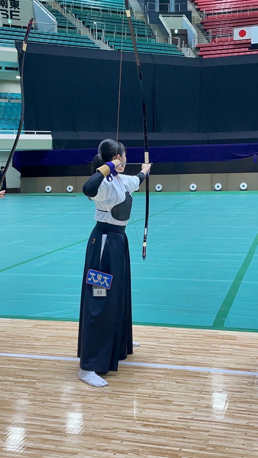 いつもの練習試合や試合とは比べ物にならないくらい緊張しました。団体戦と個人戦の両方に出場するので結果を残して帰りたいと大会に臨みました。団体戦では一試合一試合自分のやるべき事だけに集中しました。惜しくも準決勝で敗れてしまったので、個人戦では一本一本 自分のやるべき事 に集中し、 最後は楽しんで引こうという気持ちで射場に立ちました。優勝してたくさんの人に祝福の言葉を頂き、 改めて自分を支えてくれる人、応援してくれる人がいるのだと実感しました。ここで終わりではなく、次の大会も自分の納得のいく試合をし、成績を残していきたいです。