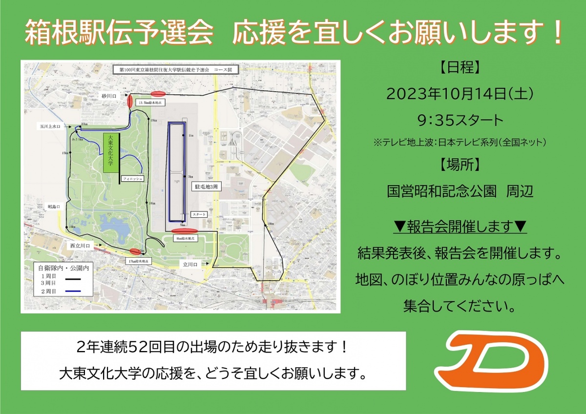 2023年10月14日(土)に陸上自衛隊立川駐屯地~立川市街地~国営昭和記念公園(東京都・立川市)で開催される第 100 回東京箱根間往復大学駅伝競走予選会に本学陸上競技部男子長距離が出場いたします。