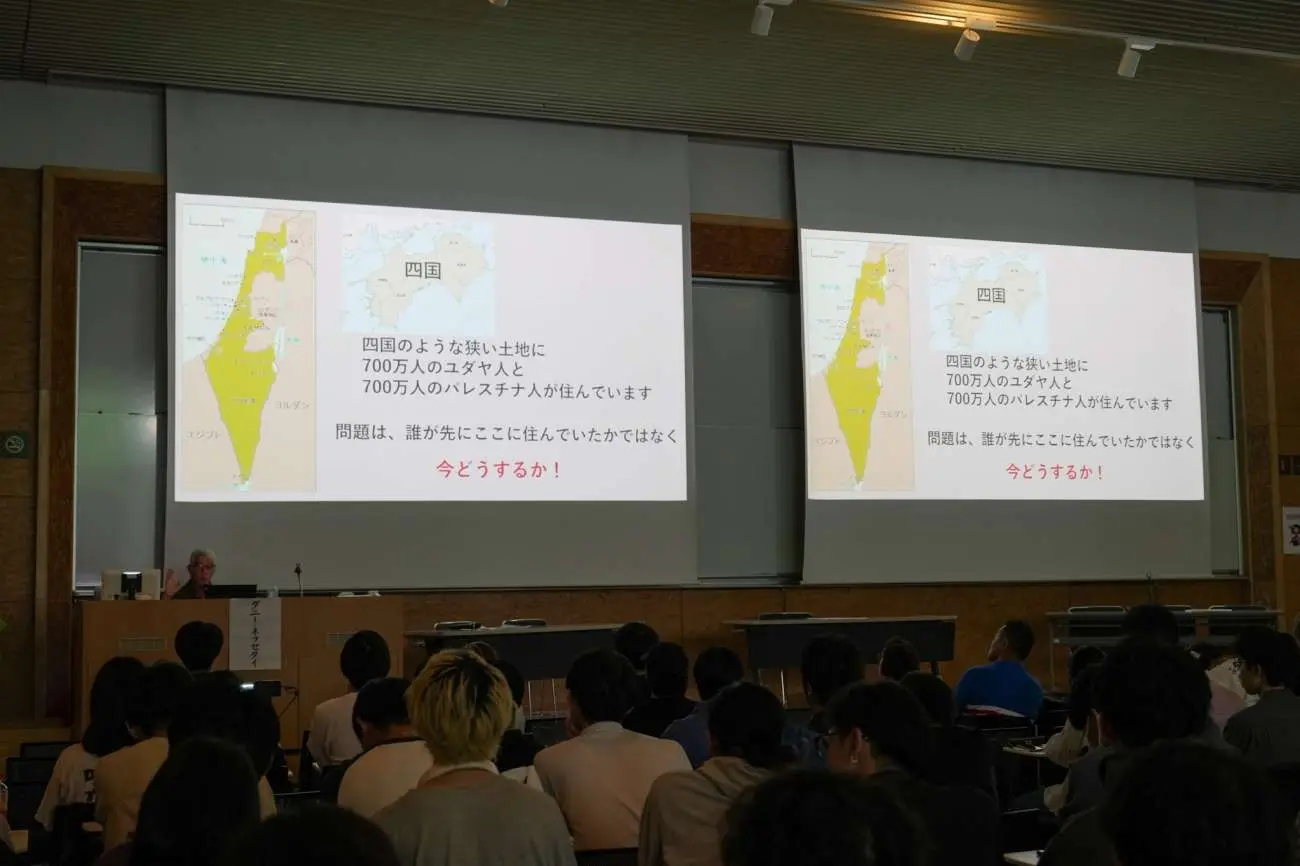 講演は、ダニーさんが空軍パイロットになることは、イスラエル男子にとって憧れであり誇りであったこと、「国のために死ぬことは素晴らしい」ということに何の疑問ももっていなかったことから語られました。しかし、日本に住んで外からイスラエルという国を見たときに、戦闘機は物を破壊すること、人間を殺すことしかできないことに気づきます。学校で戦争をどう教えているか、何年に何々戦争が起こったと、戦争の歴史しか教えないから戦争するのは人間の本能だと思ってしまう。動物は獲物を捕らえることが本能だが、人間のDNAには敵を殺すことは組み込まれていない。敵だと思わされているからであって、同じ人間なんだと分かれば戦争は起きない。日本には憲法9条という素晴らしいものがある。日本の防衛費は約8兆円。額が大きすぎてピンとこないが、こうして講演を聴いている間にもご飯を食べている間にも、1秒間に31万円が消えている計算になる。戦闘機は1時間にトラック1800台分のガソリンを使い、地球全体の環境破壊を進めている。今、ガザで起こっていること、それはどうして起きてしまったのか、教育にできることは何なのかなど多岐に渡りました。