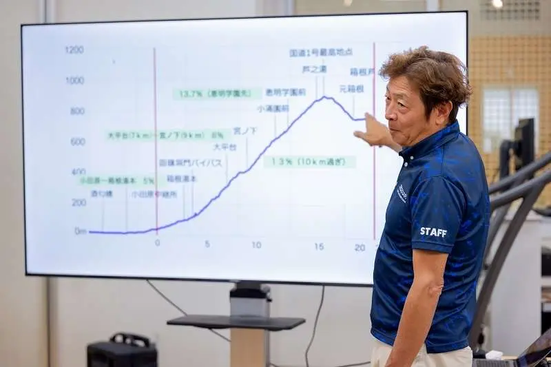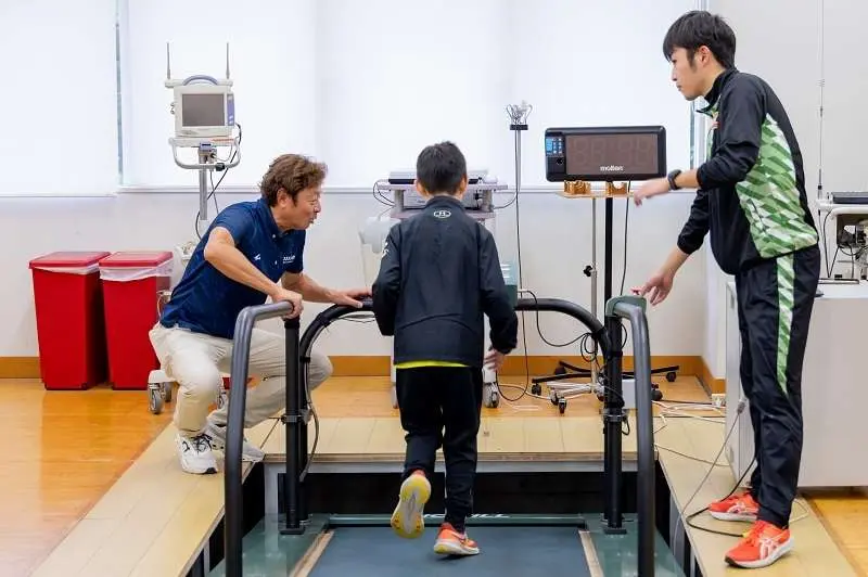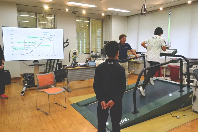 本学スポーツ科学科の教授による体験イベント「箱根の山に挑戦しよう!」では、実験室の本格的な機材を使用しました。地面に凹凸のあるコンベアが直接傾く構造は、参加された方からは「まるで本物だ」「想像以上の急傾斜」と迫力に満ちた声がありました。その傾斜を身をもって体験した参加者からは、満足そうな表情や、楽しそうに息を切らす様子が見られ、テレビで見る「山の神」の過酷さと挑戦の喜びを体感する貴重な機会となりました。